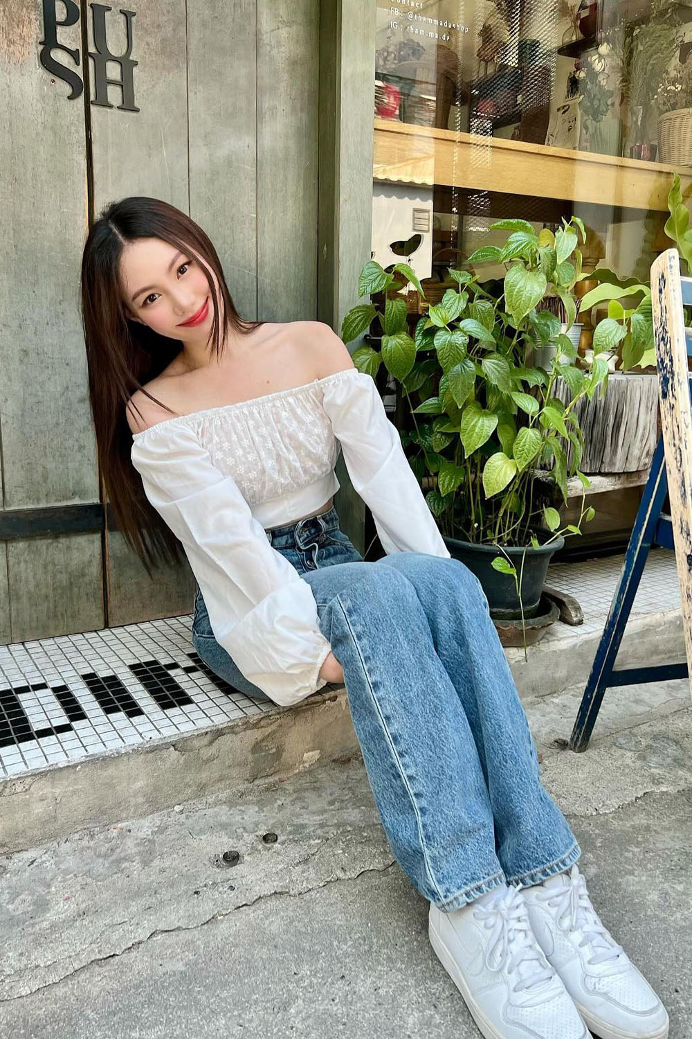 The smocked texture of the top keeps it girly without being too extra, and the light wash jeans bring all the 90s throwback feels (in the best way). Plus, those clean white kicks? Chef’s kiss. Whether you’re running errands or just soaking up the sunny vibes, this look is effortlessly chill and cute at the same time.