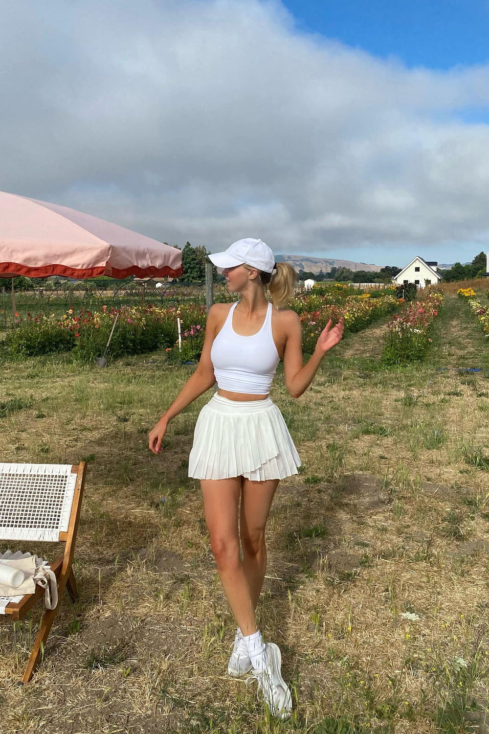 OMG, sporty but make it adorable! This white tennis skirt and matching white crop top combo is seriously such a vibe for summer. It’s crisp, cute, and SO ready for everything from flower field strolls to cute outdoor picnics. And that baseball cap? Total cherry on top.