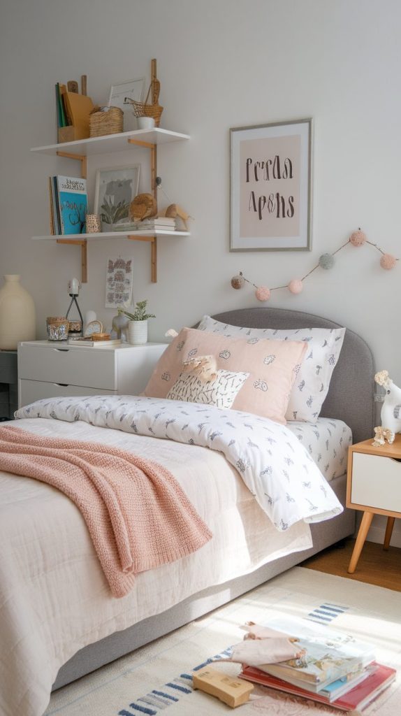 Gallery walls let you rotate art as interests change. I mix illustrations, kids drawings, and typography prints. This approach keeps the room personal and ever-evolving.