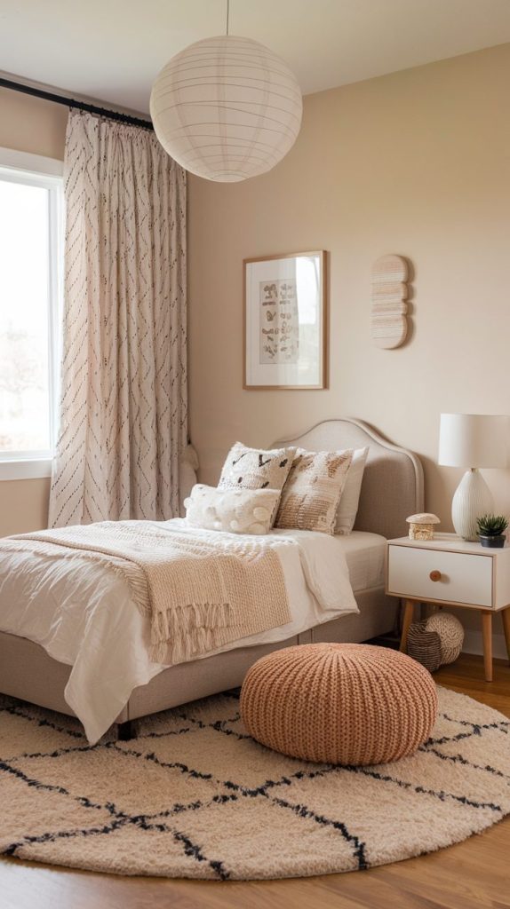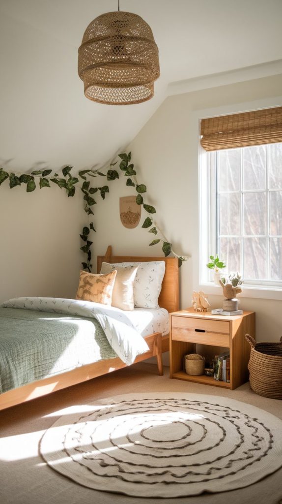 I use wood furniture, woven baskets, and cotton fabrics to set the tone. Green accents through plants or wall art connect kids to nature. Even faux plants work if sunlight stays limited.