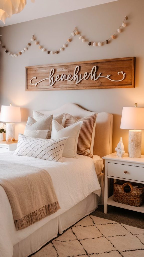 Wooden name signs work beautifully above beds or desks. Fabric banners add softness and texture. Wall decals offer easy updates as styles change.