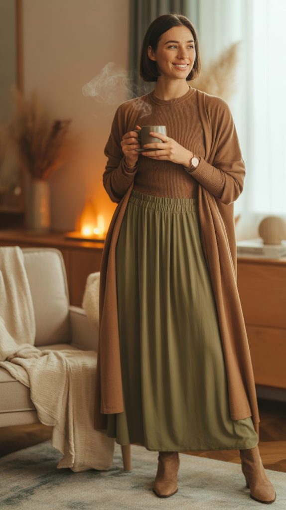 For those lazy winter days when effort feels optional but style is still mandatory, this combo is perfection. Layer a thermal top, maxi skirt, and a long cardigan.