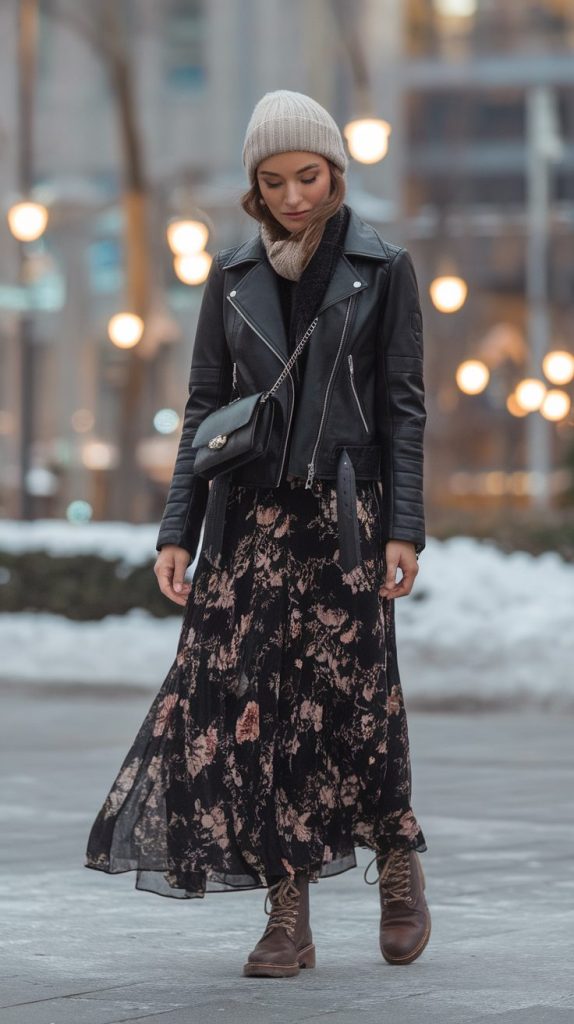 3. Leather Jacket + Floral Maxi = Rebel Winter Energy