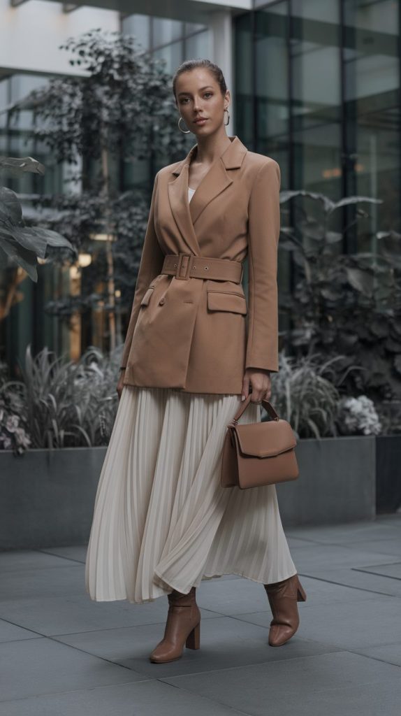- The blazer structure contrasts beautifully with the soft skirt flow.