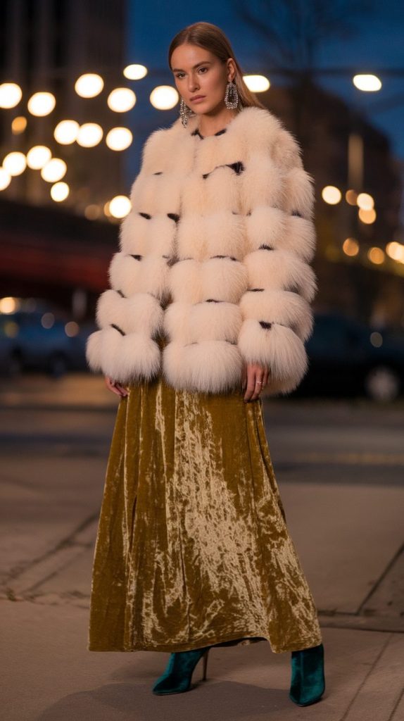 If winter fashion had a “main character” moment, this would be it. Pair a velvet maxi skirt with a plush faux fur coat for a look that screams luxury without the designer price tag.