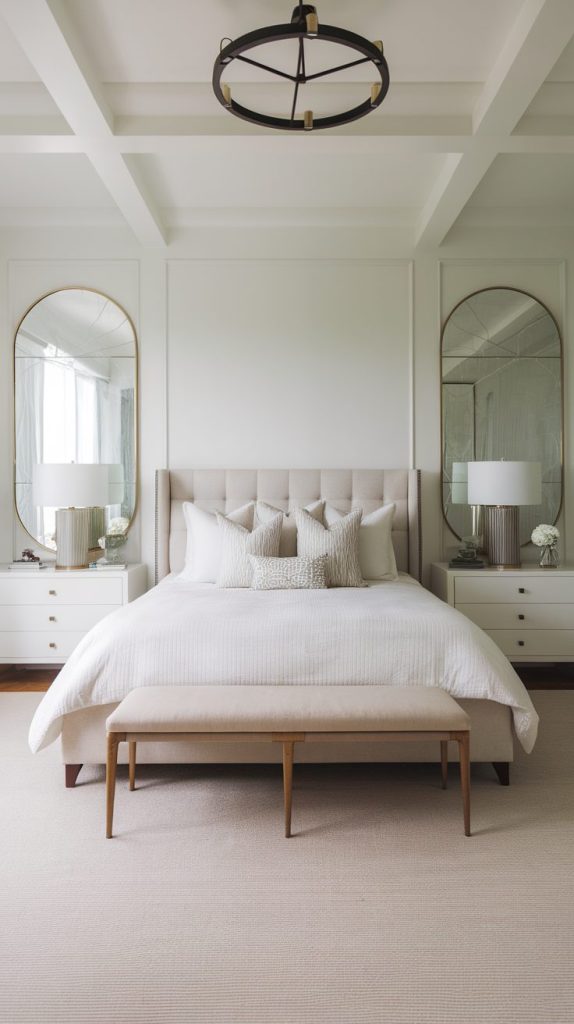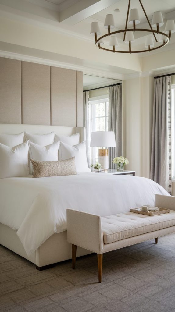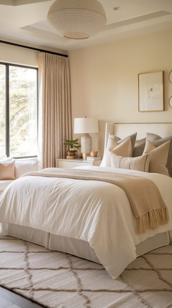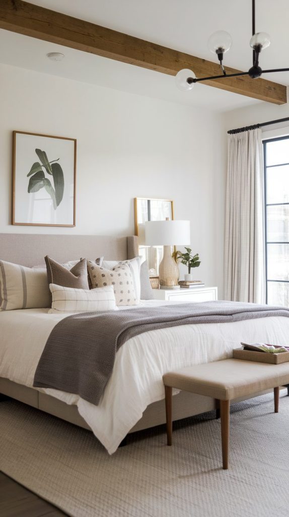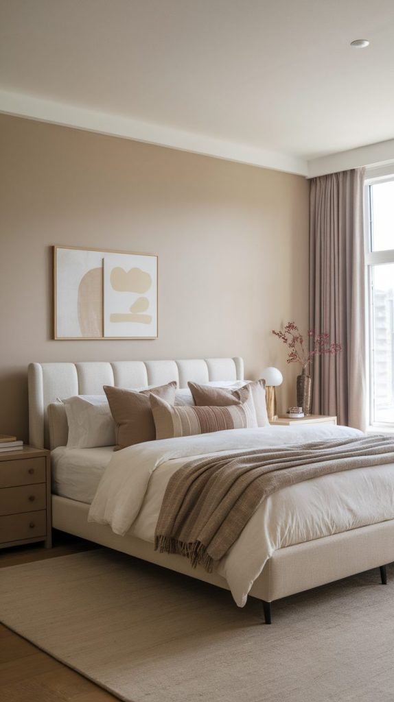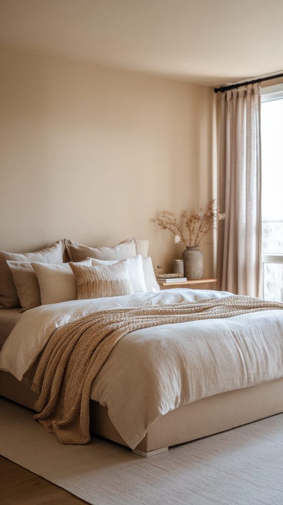 Start with a soft neutral base like warm white, beige, or greige on the walls and bedding. I prefer warm neutrals over cool gray because they feel cozy instead of cold. You can still keep things modern without turning the room into a hospital.