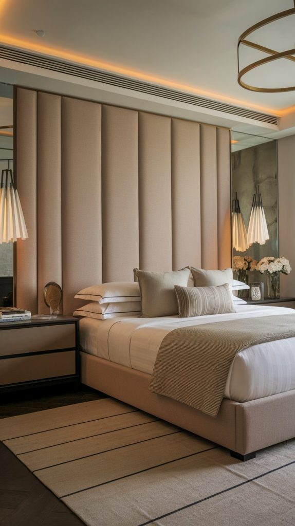 Oversized headboards create a hotel-like feel that instantly elevates the room. Let the headboard stretch wider than the bed for drama. This trick makes even basic bedding look luxurious.