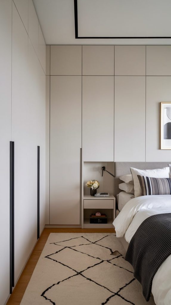 Built-in wardrobes with flat-panel doors keep the room sleek. Handleless designs or slim pulls look especially modern. They blend into the wall instead of screaming for attention.