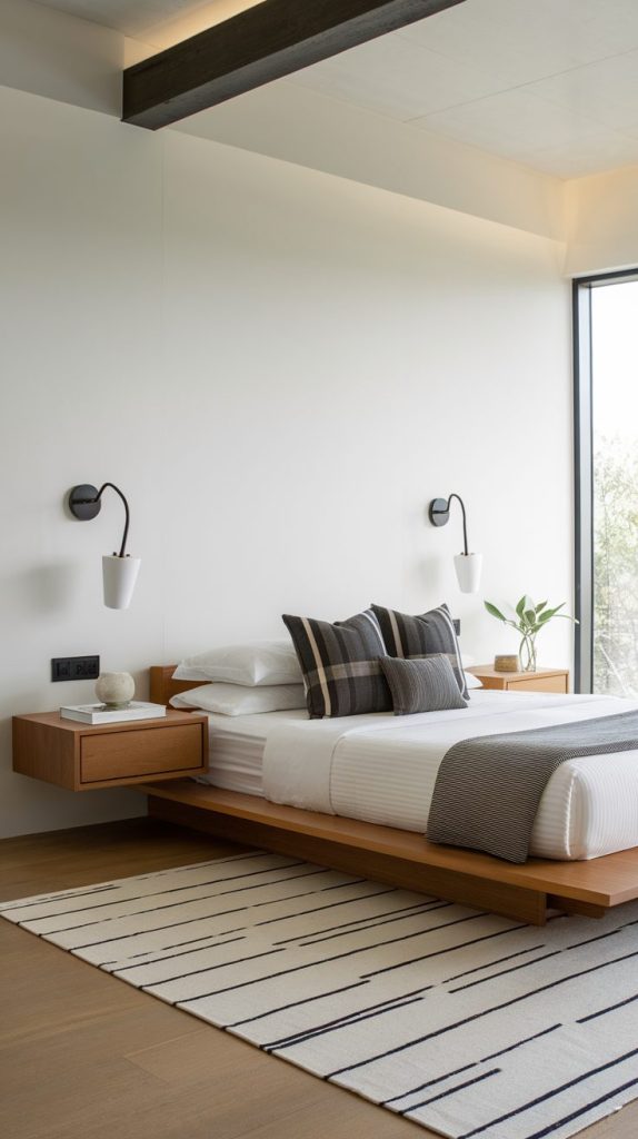 Add a soft area rug to ground the bed visually. Rugs warm up the space and make mornings more pleasant. I love low-pile rugs for modern bedrooms.
