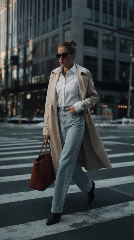 10. The Elegant Twist: Mom Jeans + Button-Down Shirt + Trench Coat