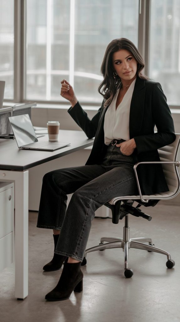 4. The Office-Ready Chic: Mom Jeans + Blazer + Heeled Boots