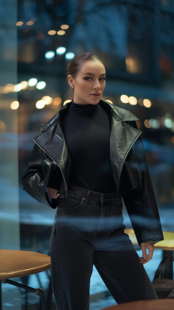 6. The Evening Edge: Mom Jeans + Black Turtleneck + Leather Jacket