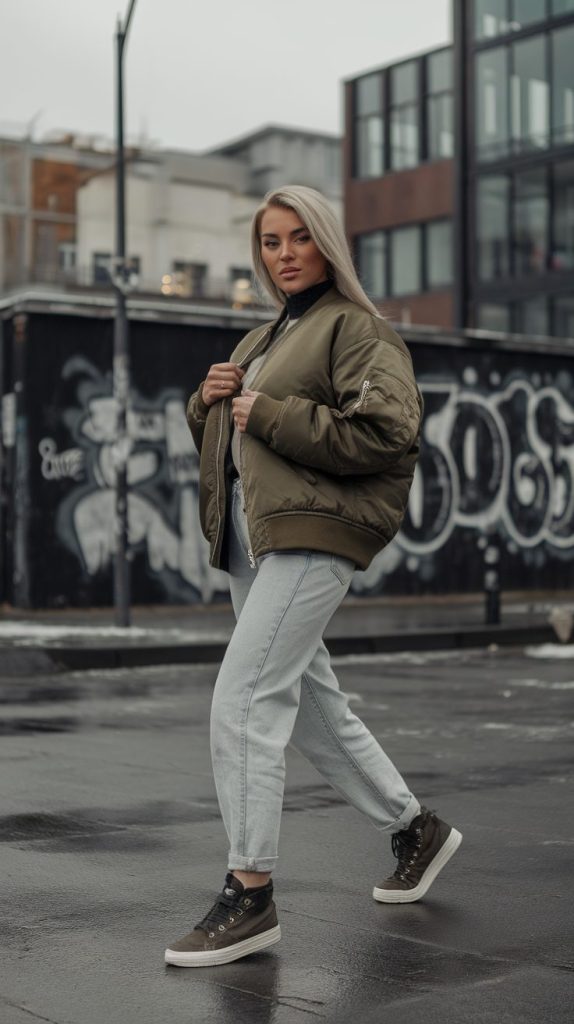8. The Street-Style Icon: Mom Jeans + Oversized Bomber + Sneakers