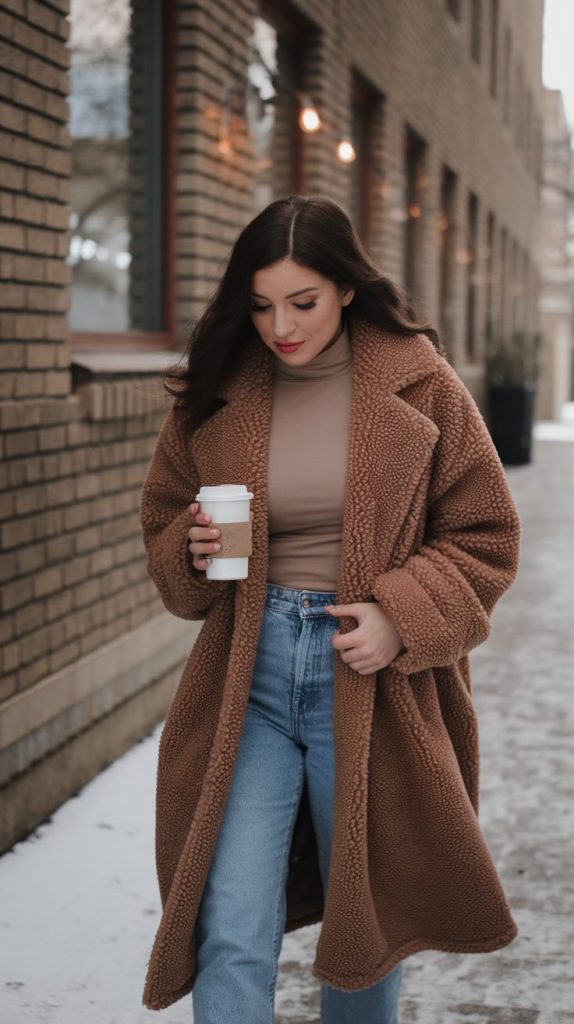 9. The Cozy Layer Luxe: Mom Jeans + Turtleneck + Teddy Coat