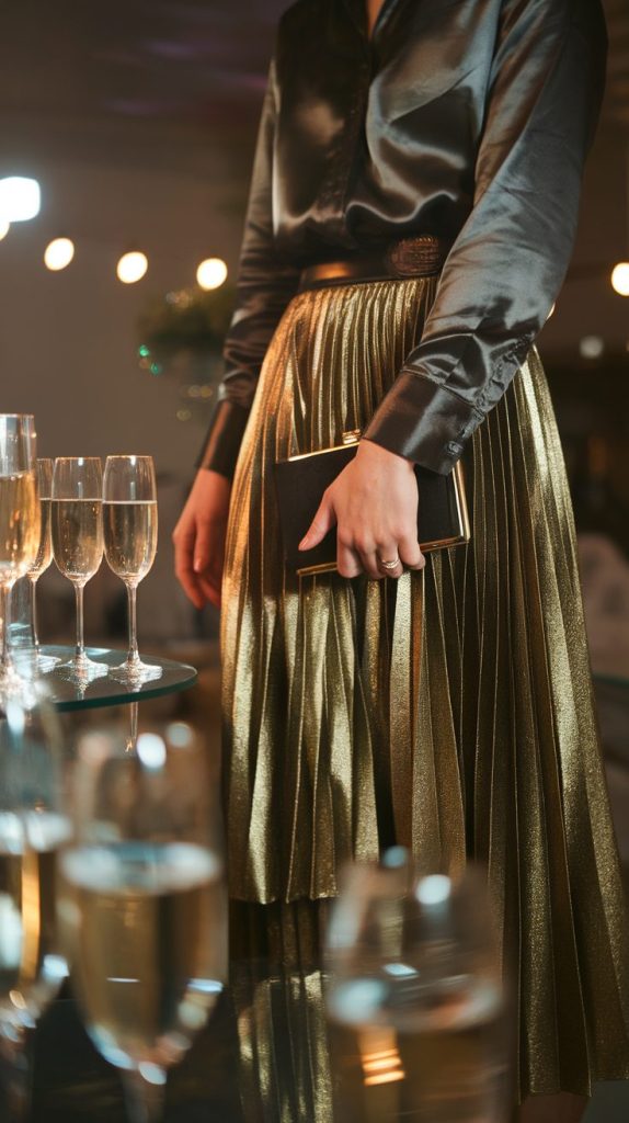 • A metallic pleated skirt (silver, gold, rose-gold) that catches light without screaming for attention.