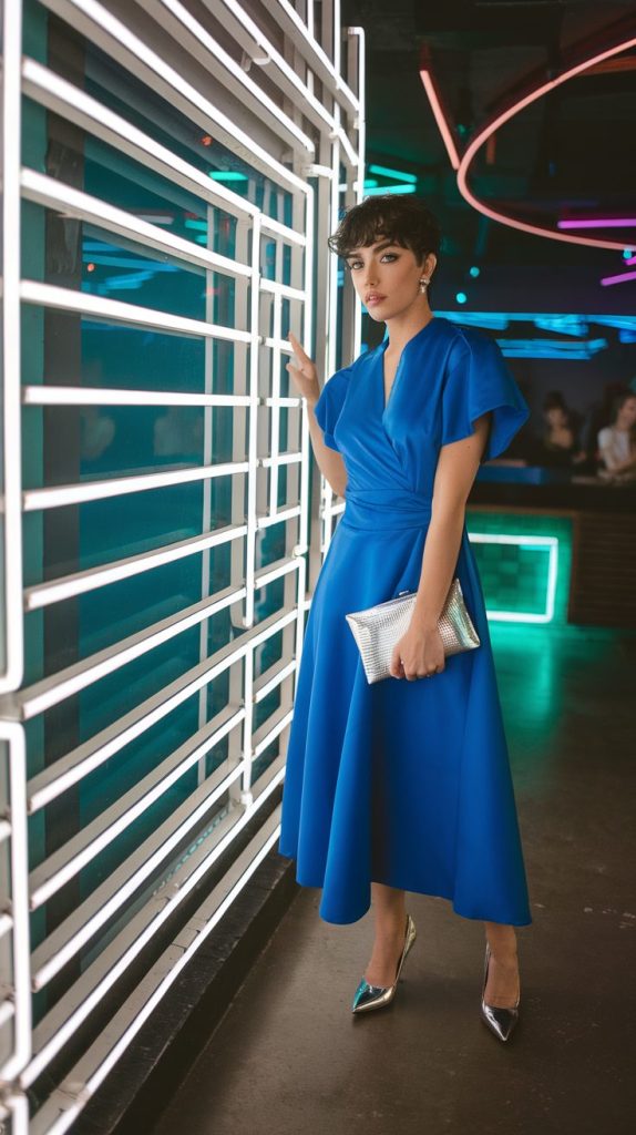 If you’re bored of black/metal, go bold. Think vibrant color-block dress or suit (hot pink, cobalt blue) but add metallic accessories so you still hit party mode.