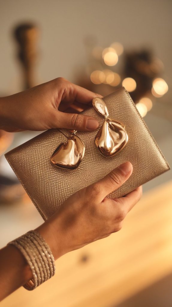 • Accessories in the same metal tone (shoe, clutch) to tie the look together.