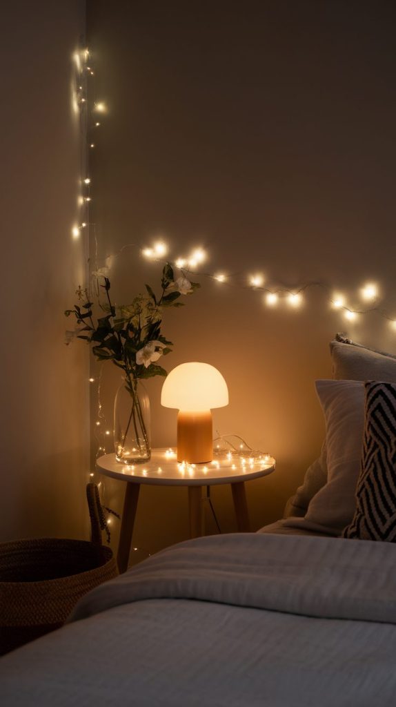 Overhead lighting often feels aggressive, especially in bedrooms. I prefer lamps, fairy lights, or warm bulbs because they soften the room instantly. Lighting controls mood more than most people realize.
