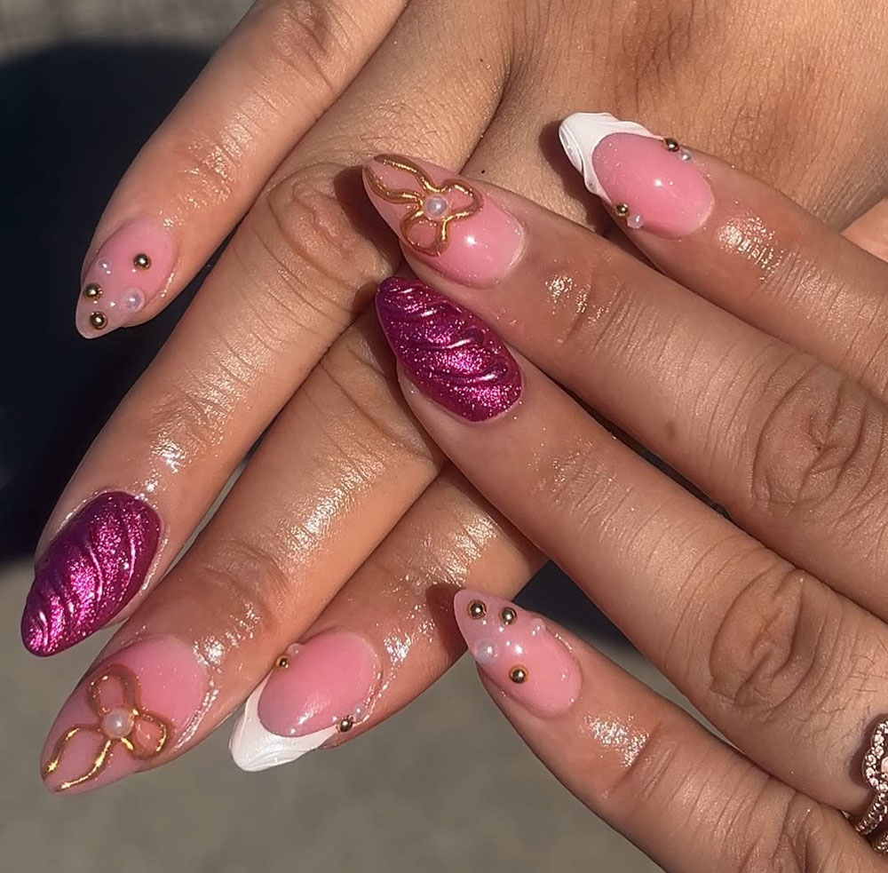 The mix of textures—from smooth glossy pink to sculpted 3D details—makes these nails feel super luxe. Gold floral accents add a royal touch, while the magenta shimmer brings in that party-ready sparkle.