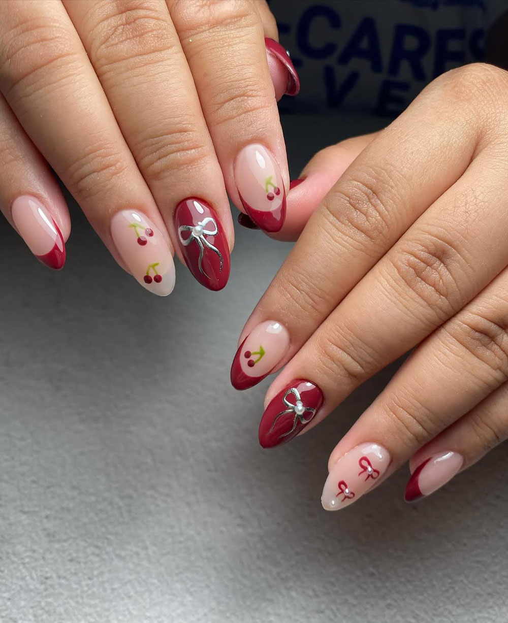 A classic French tip just got a birthday makeover! These rich red tips with delicate cherry and bow accents are the perfect mix of sweet and sophisticated.