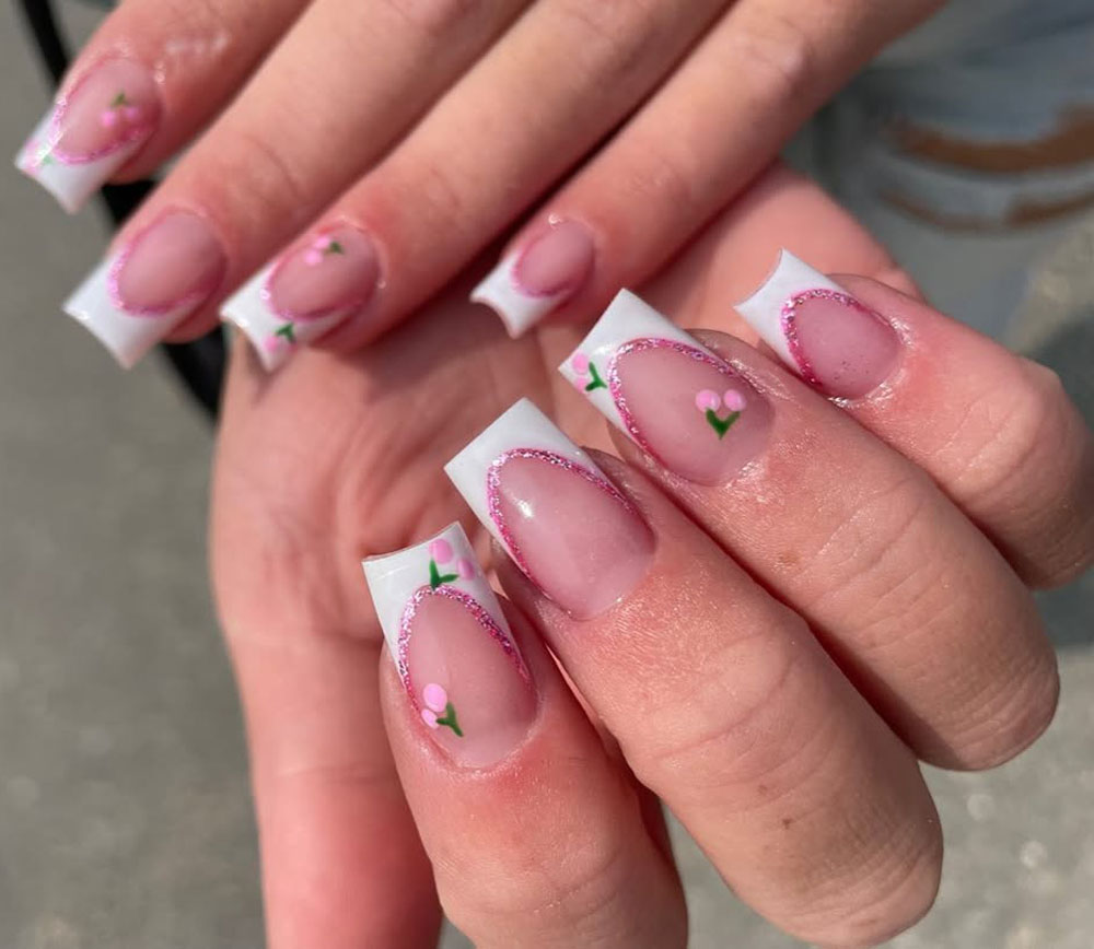 A fresh and modern take on classic French tips! These soft pink nails feature crisp white tips with a hint of pink glitter and floral details for a subtle yet stunning effect.