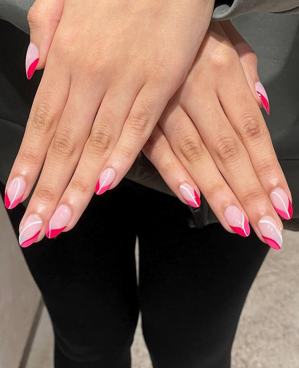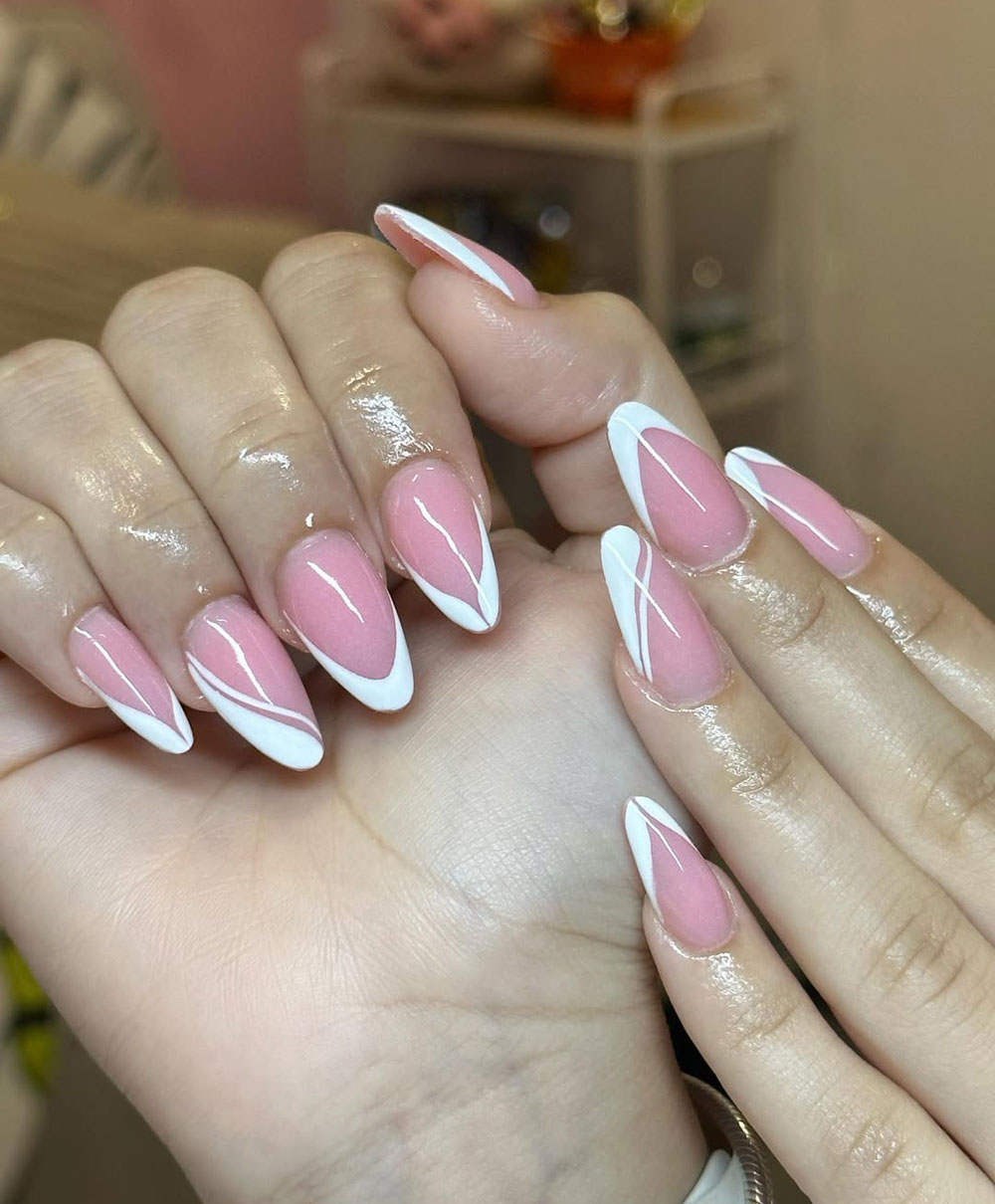 Clean, modern, and totally stylish—this pink and white abstract French tip design is effortlessly cool. The mix of crisp white lines and soft pink creates a chic and minimalist look.