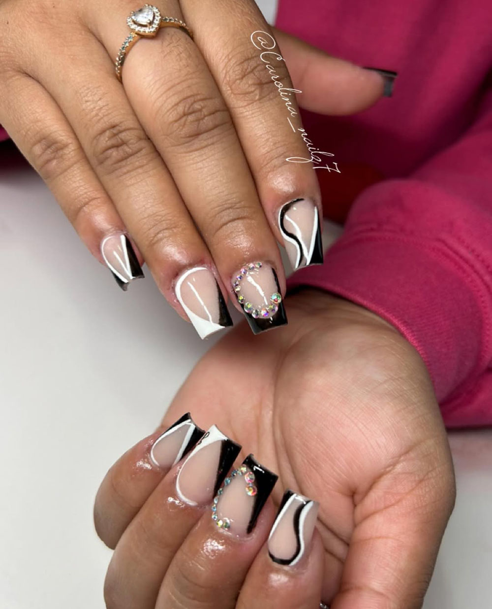 The mix of black and white swirls creates an ultra-modern look, while the crystal accents make sure your nails sparkle with every move. This set is all about making a statement!