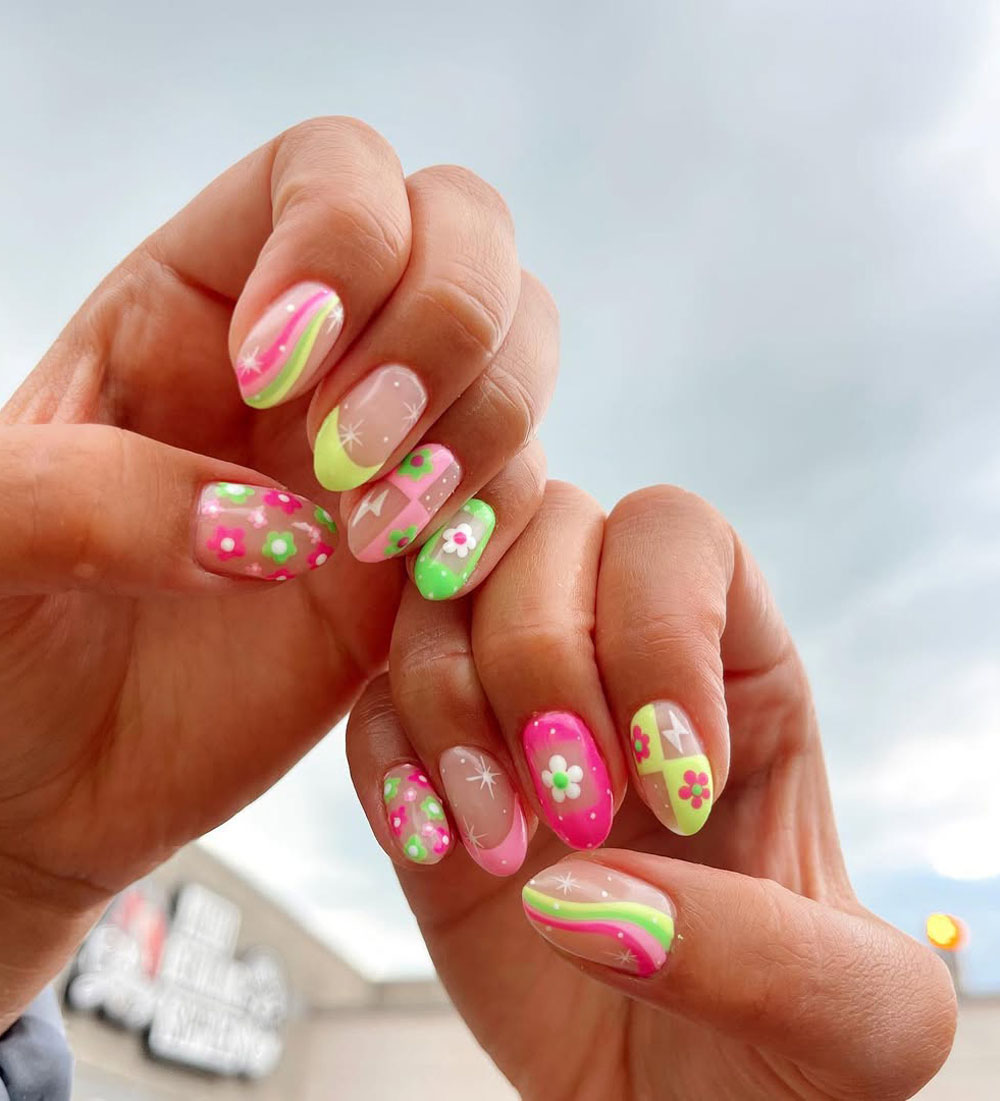 This look is fresh, youthful, and totally unique. The neon green and pink combo gives major Y2K vibes, making it perfect for someone who loves playful and trendy nails.