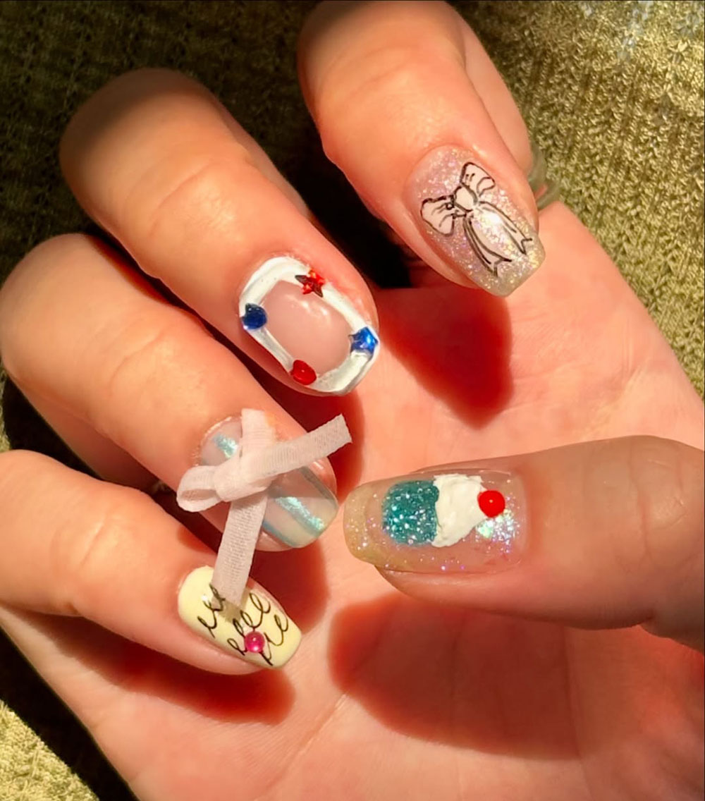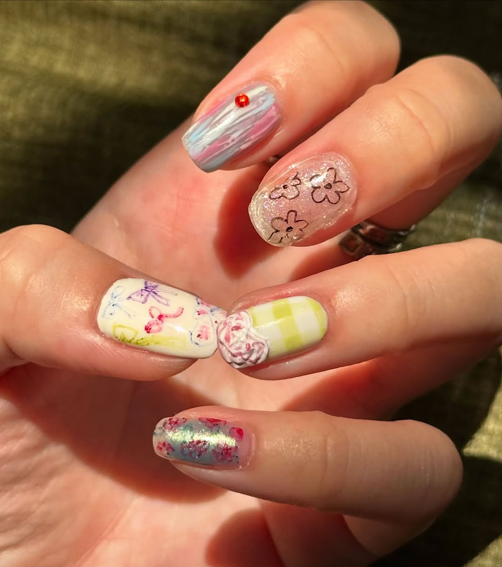This adorable pastel nail design looks like a mix of vintage-inspired elements and a sweet spring picnic. With tiny cherries, florals, bows, and gingham patterns, this set is full of cute little surprises.
