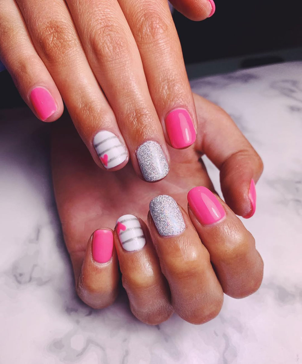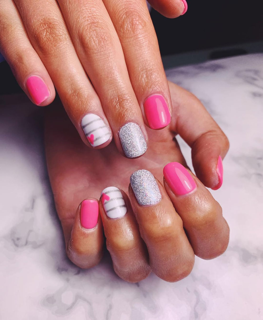Pink, silver, and adorable heart details? This set is giving birthday princess in the best way possible! The mix of solid pink, silver glitter, and striped nail art with a tiny heart is a combo that screams fun and flirty.