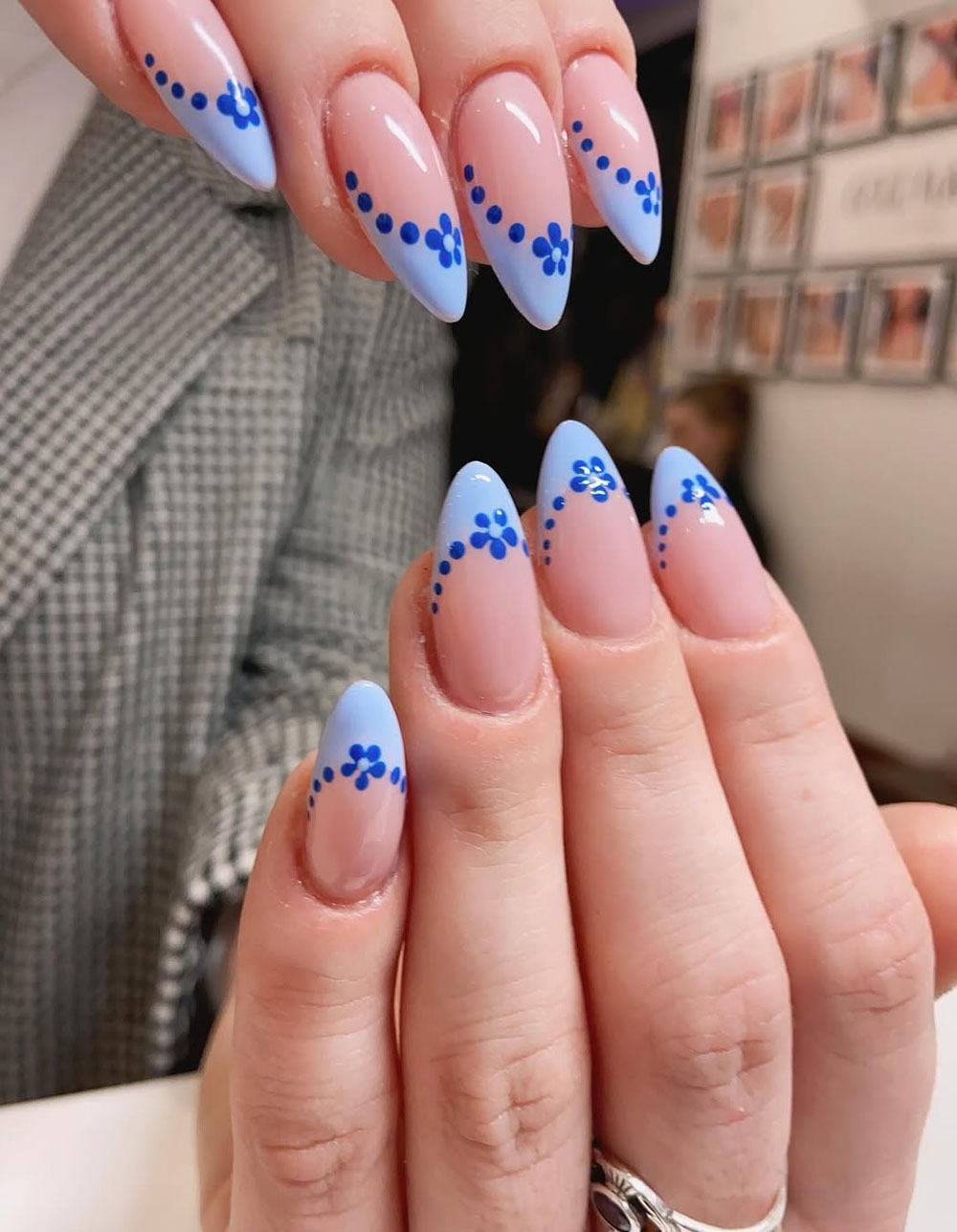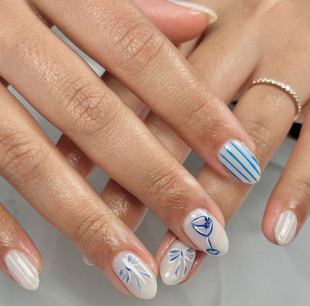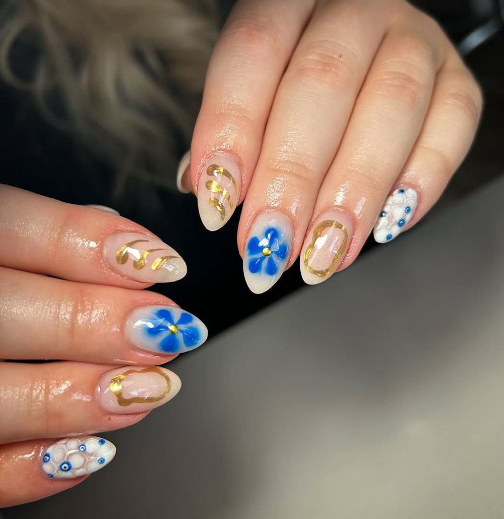 This look is perfect for anyone who wants a unique, artsy manicure with a touch of elegance. The combination of pastel blues and soft florals gives off an effortlessly dreamy vibe.