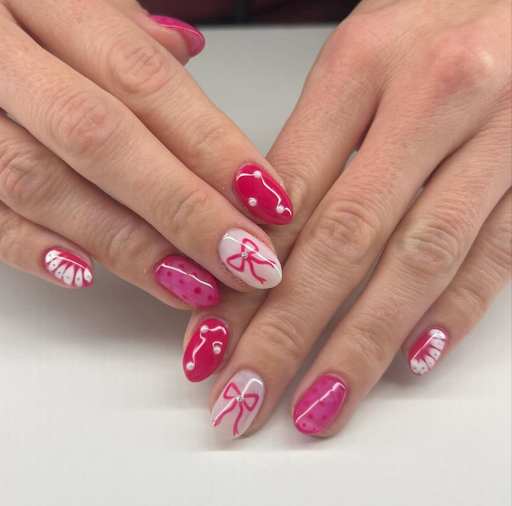 Red and pink are always a winning combo for celebrations, and these nails prove it! The mix of designs makes each nail unique while still looking cohesive and stylish.