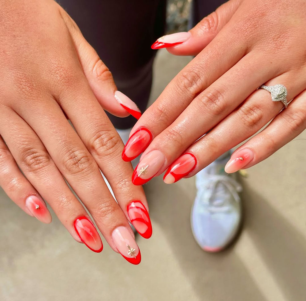 The blend of bold red and delicate nude makes this design super versatile—you can wear it with a glam dress or a sleek, casual outfit and still turn heads. The tiny gold stars add just the right amount of sparkle!