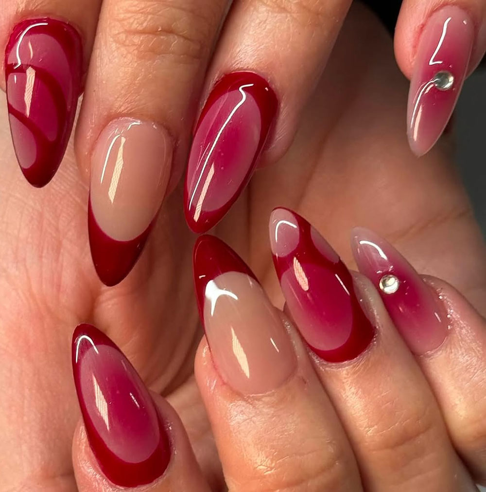 These nails are serving drama and elegance with a sultry deep burgundy ombre effect. The glossy finish and single rhinestone accents make this design feel effortlessly luxurious.