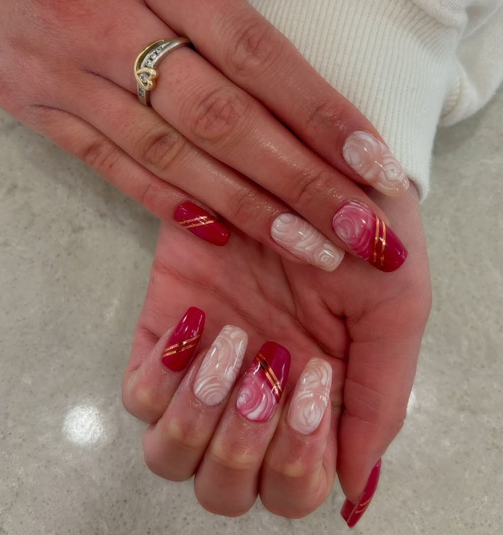 These nails are a work of art! A mix of soft white and deep red with gold-lined swirls creates an elegant marble effect that looks like carved roses. The glossy finish adds even more depth to the design.