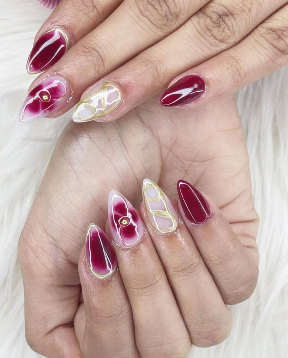 This nail design is inspired by the beauty of orchids, featuring rich red tones, delicate floral detailing, and gold-lined geometric accents. The glossy finish makes the deep hues even more striking.