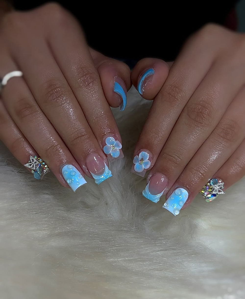 Soft, icy blue tones meet floral magic in this stunning nail set. The combination of baby blue French tips, 3D floral appliques, and sparkling embellishments gives this manicure a delicate yet glamorous feel.