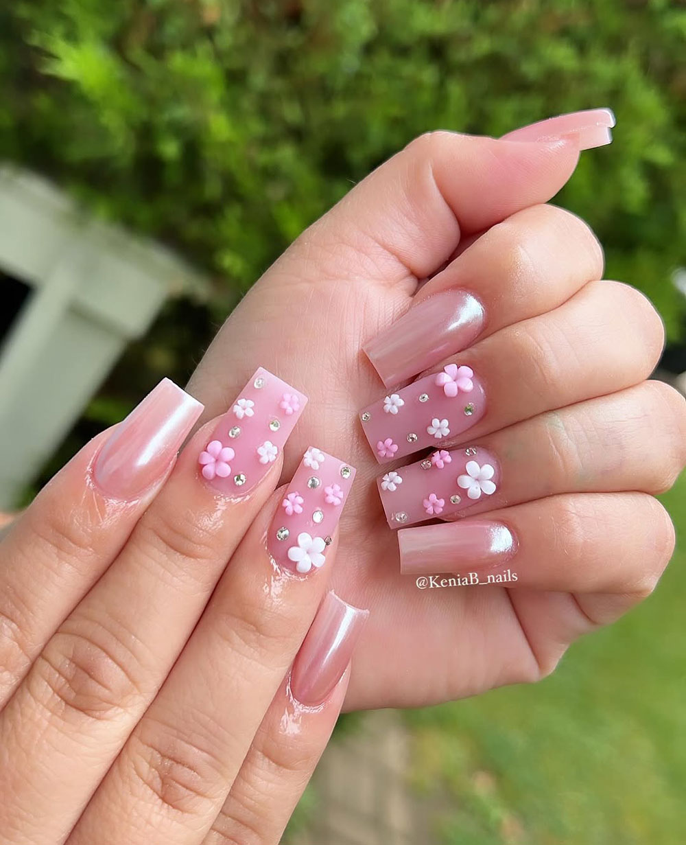 This design is for all the floral lovers out there! A soft pink base is adorned with 3D flowers and tiny rhinestone accents, giving the perfect balance of sweet and sophisticated.