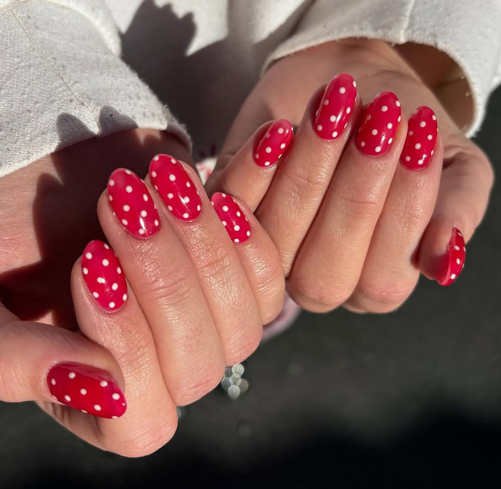 The glossy red base pops against the crisp white dots, making it a bold yet timeless look. It’s perfect for anyone who loves a little bit of retro charm in their style.
