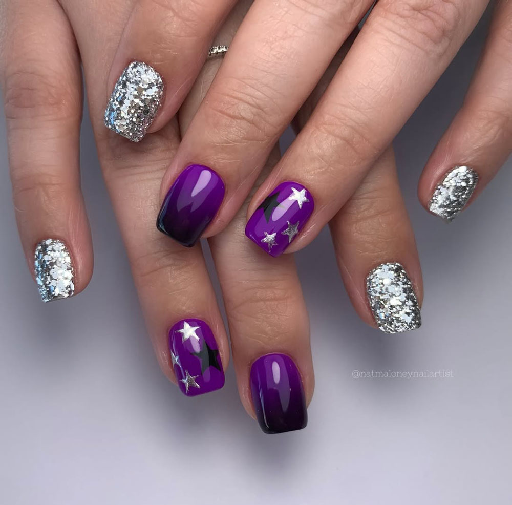 This deep purple and silver glitter combo is straight-up celestial! The dark purple gradient is paired with shining silver stars and glitter, making it look like a little galaxy on your nails.