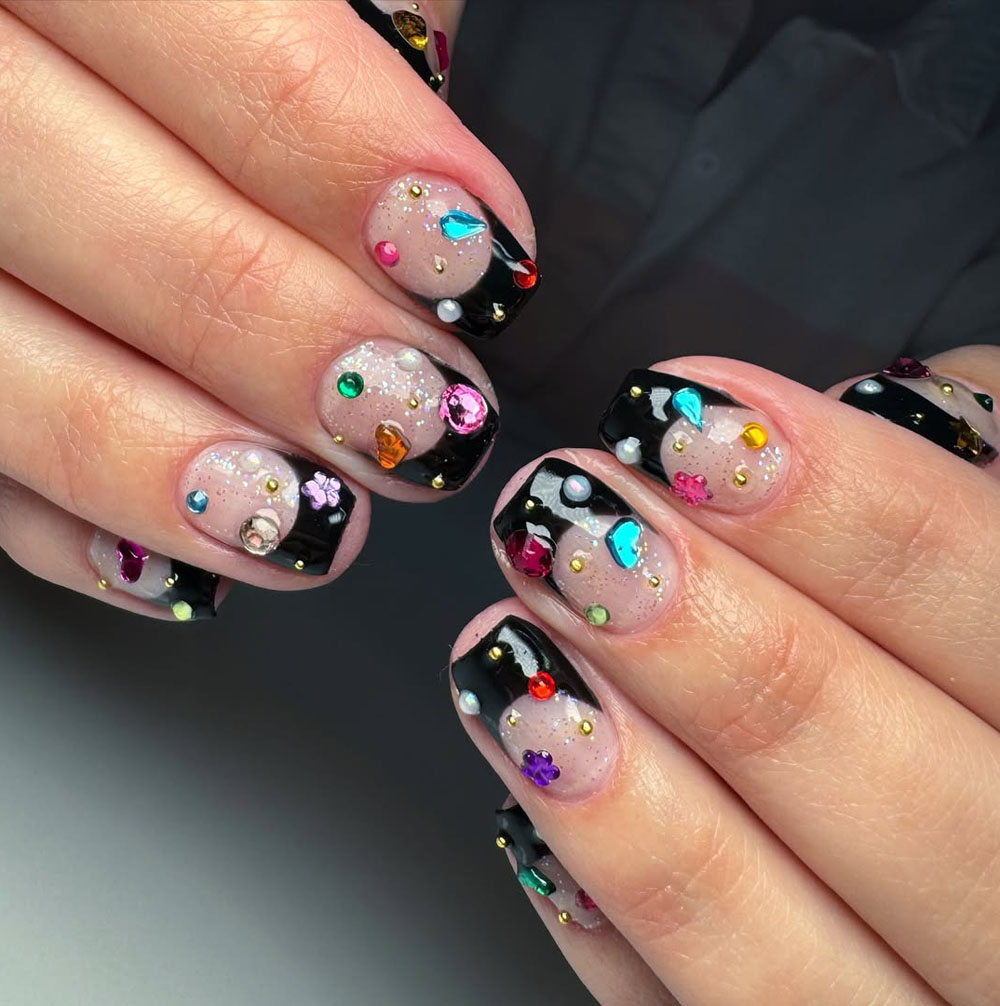 Talk about luxury! This black and nude French tip design is decked out with colorful gems and pearls, making it the ultimate birthday statement nail.