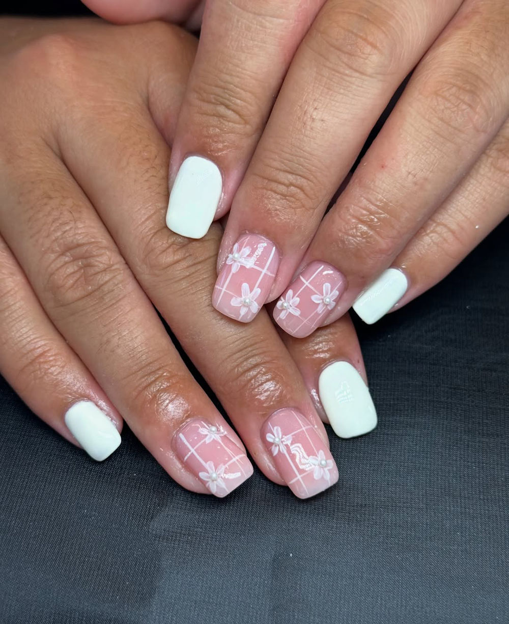 51. Soft Pink & White Plaid Daisy Nails