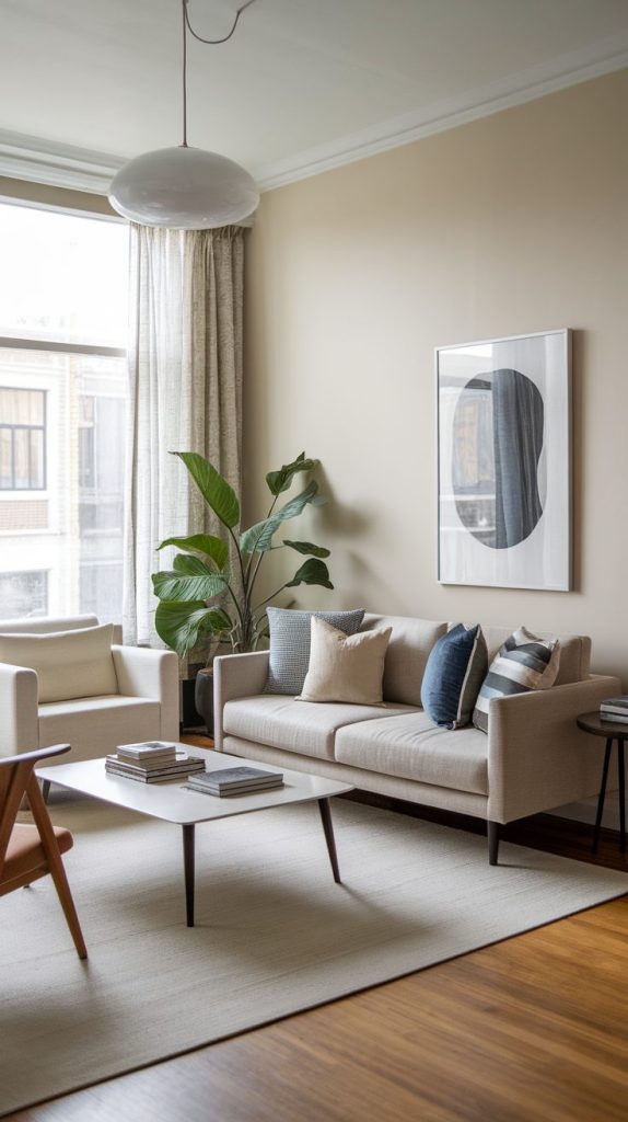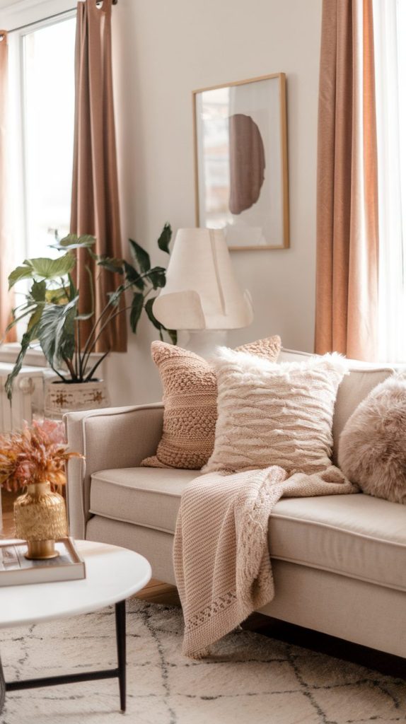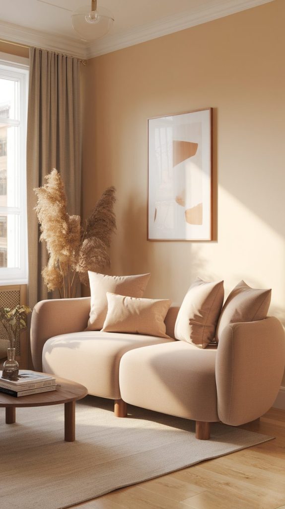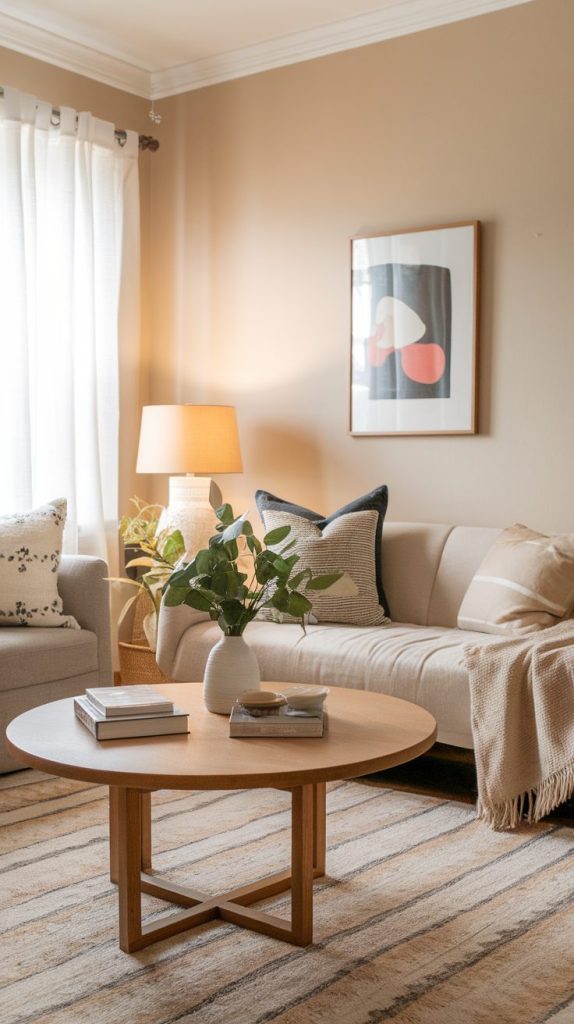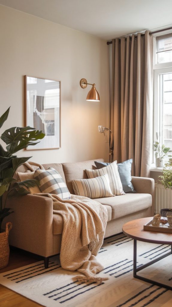 Use multiple shades of the same color family to avoid a flat look. A beige sofa, cream rug, and soft brown throw feel intentional rather than boring. This trick always makes a small living room feel designed instead of accidental.