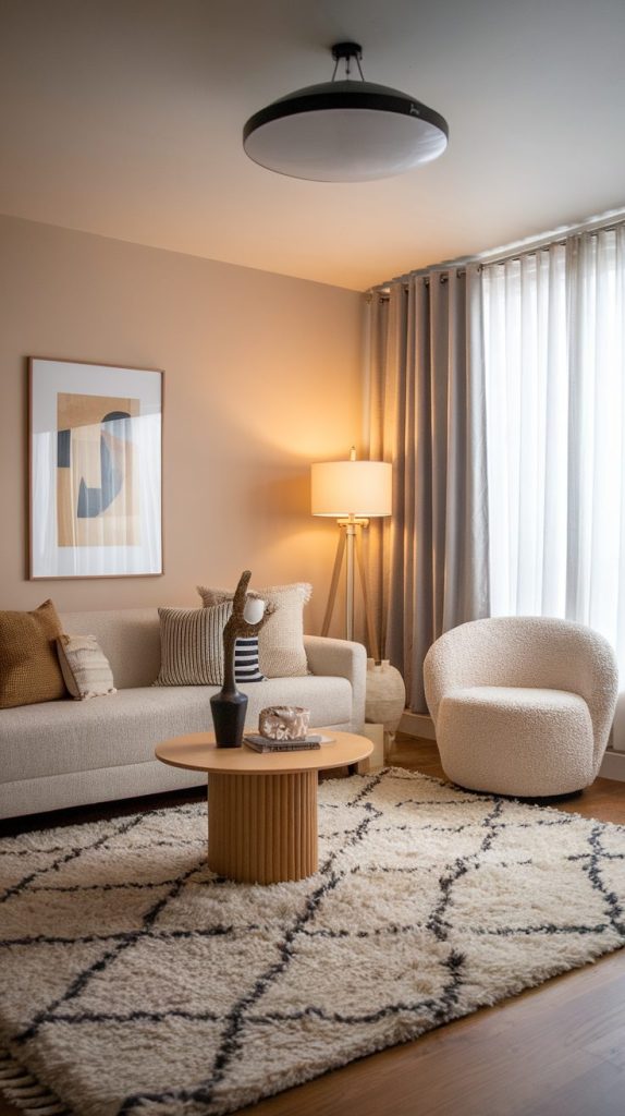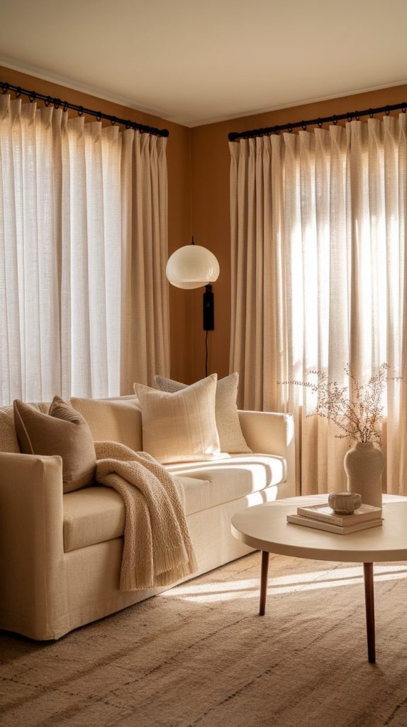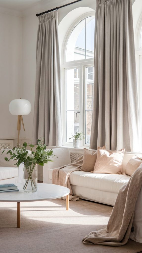 Sheer or light linen curtains keep the room airy while adding softness. Heavy drapes feel cozy in large rooms, but small apartments need breathing room.