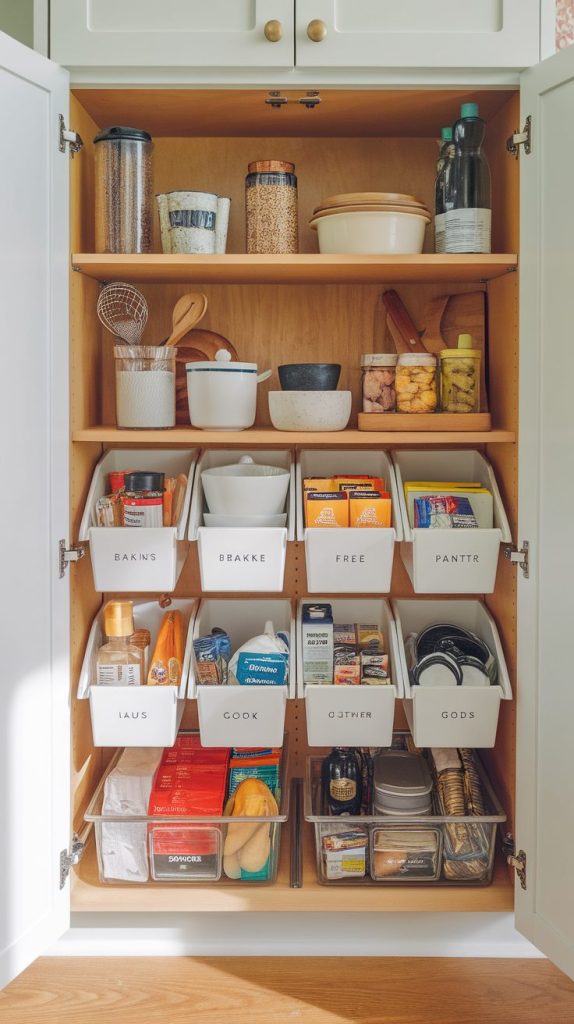 Bins act like boundaries for clutter, and labels keep things from drifting. I use labeled bins for baking supplies, breakfast items, and random packets.