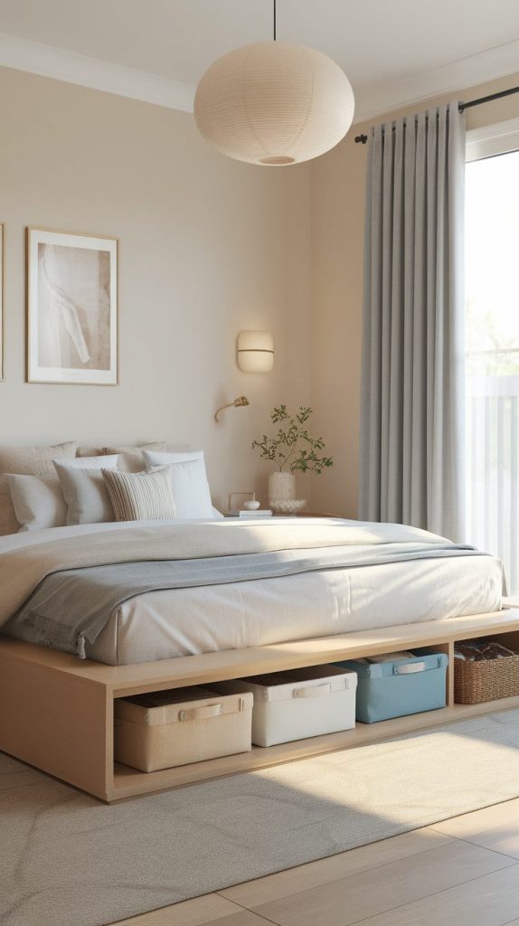 Choose low profile storage bins or drawers that slide easily and look intentional. Stick to neutral colors or soft fabrics so the space still feels light and breathable.