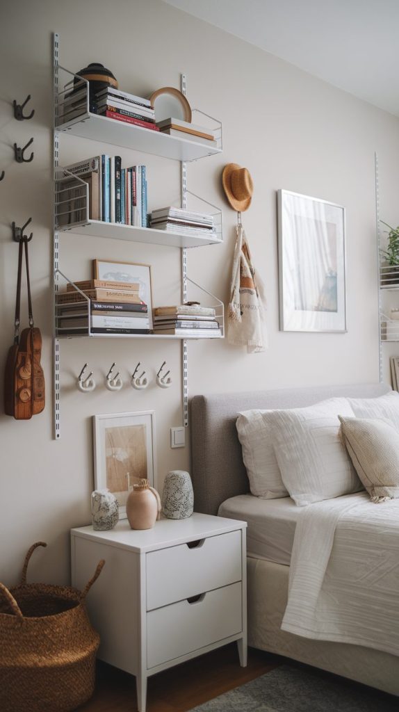 Walls hold more potential than we give them credit for. Floating shelves and wall hooks free up floor space instantly.