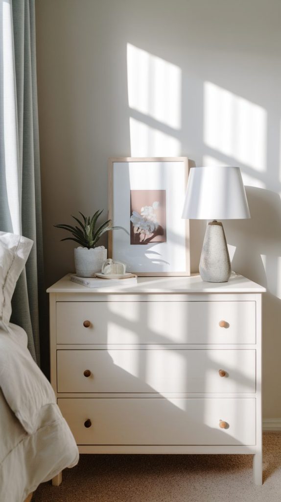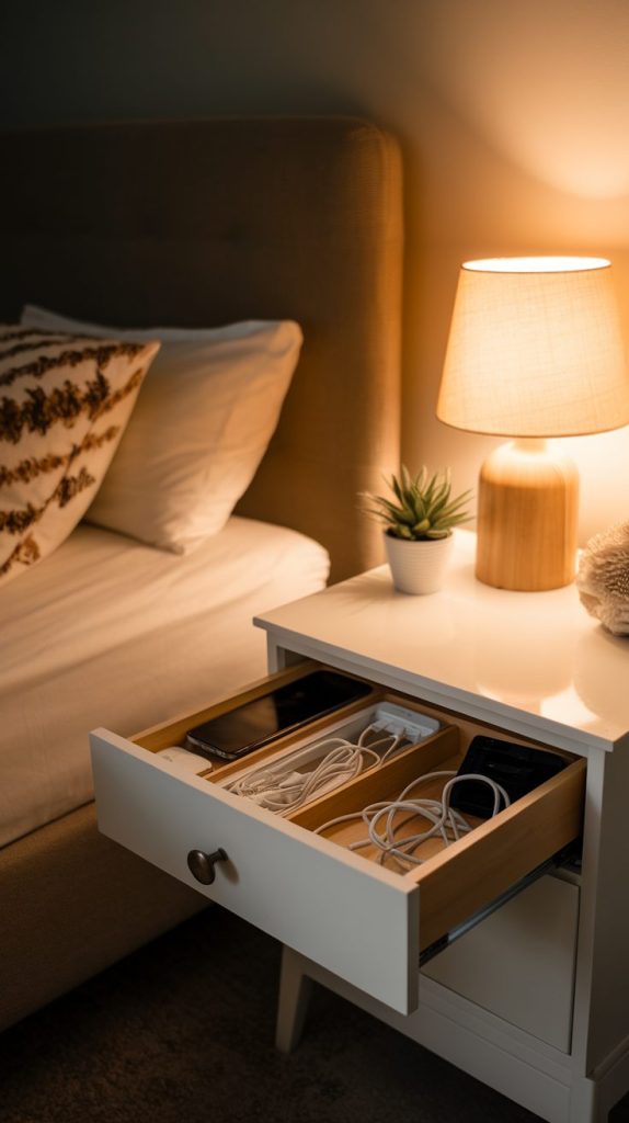Create a dedicated charging station inside a drawer or tray to keep cords hidden. Your future sleepy self will thank you.
