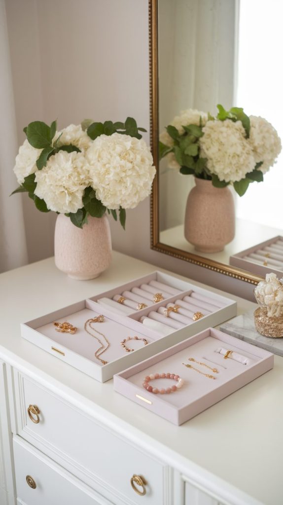 Use jewelry trays, hooks, or clear boxes so everything stays organized and easy to grab. Ever forget accessories existed because you couldn’t see them?