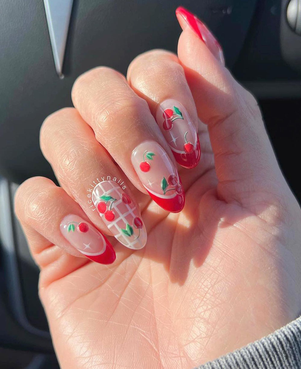 Okay, this one is so Pinterest-core! It’s like someone bottled up a vintage summer picnic and painted it on your nails. That red French tip is already cute on its own, but throw in the mini cherry clusters and that adorable grid accent nail? I can’t.